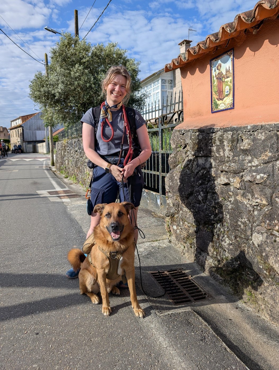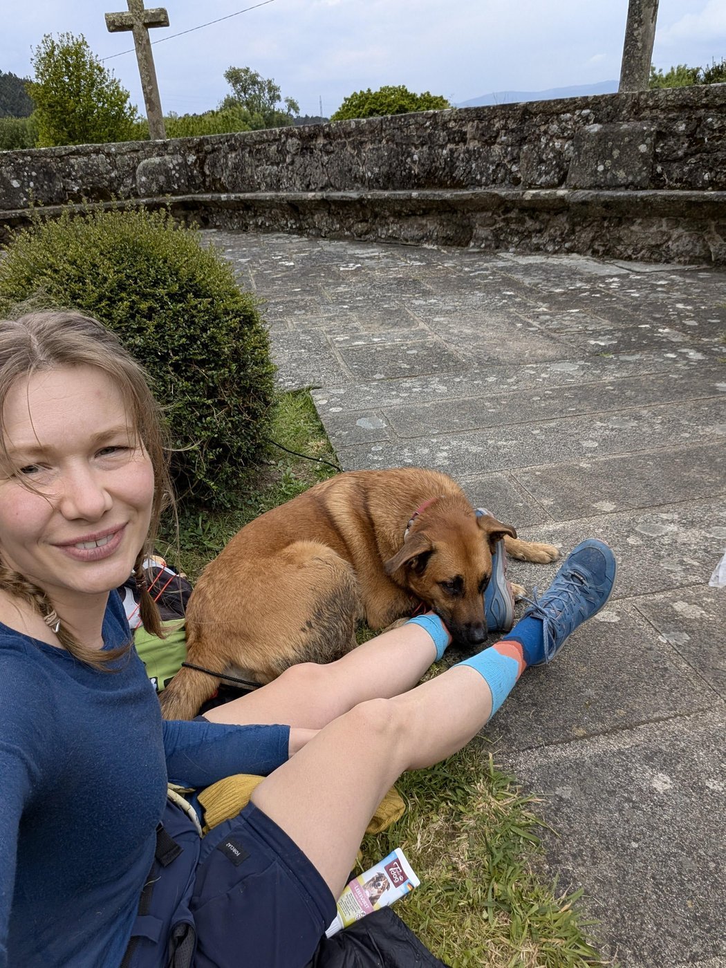 Пес приучен ждать на улице, поэтому я могла зайти в супермаркет или церковь, чтобы поставить печать в паспорт паломника. Однако один раз его чуть не увезли от магазина сердобольные зоозащитницы, и мне пришлось тормозить за собой очередь на кассе и кричать из двери магазина, что это моя собака и я ее не бросила. Буквально на 10 минут привязала, зашла в магазин за водой. Потом стала оставлять только под присмотр какого-нибудь другого пилигрима. Конечно, это пригодилось, когда надо было в городках зайти в туалет.