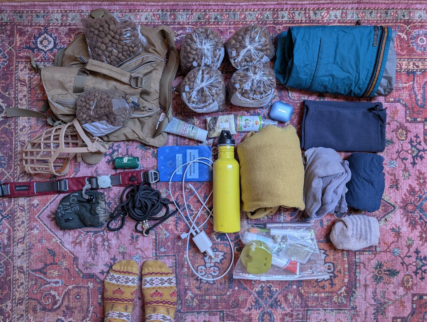 На случай, если надо было бы ехать в общественном транспорте у пса были все навыки примерного пассажира и намордник. Не пригодился, но висел поверх рюкзака, и за него было удобно цеплять недосохшие за ночь носки.