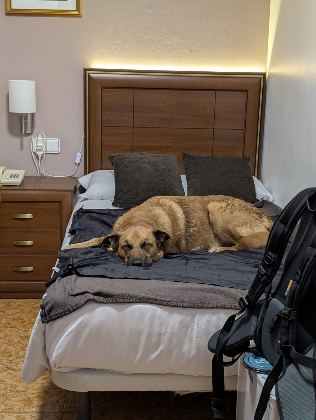 Для ночевок было огромное сверхлегкое, водонепроницаемое одеяло, которым я накрывала кровати в отелях, чтобы не пачкать. Он спал типа в ногах, хотя из-за его размеров скорее я ютилась с краю. Дома не разрешаю, но в новой для него среде и без второго хозяина эмоционально это было ему нужно. Да и было в этом что-то товарищеское, партнерское, все делить с ним пополам, раз уж он преданно шагает со мной этот Путь.