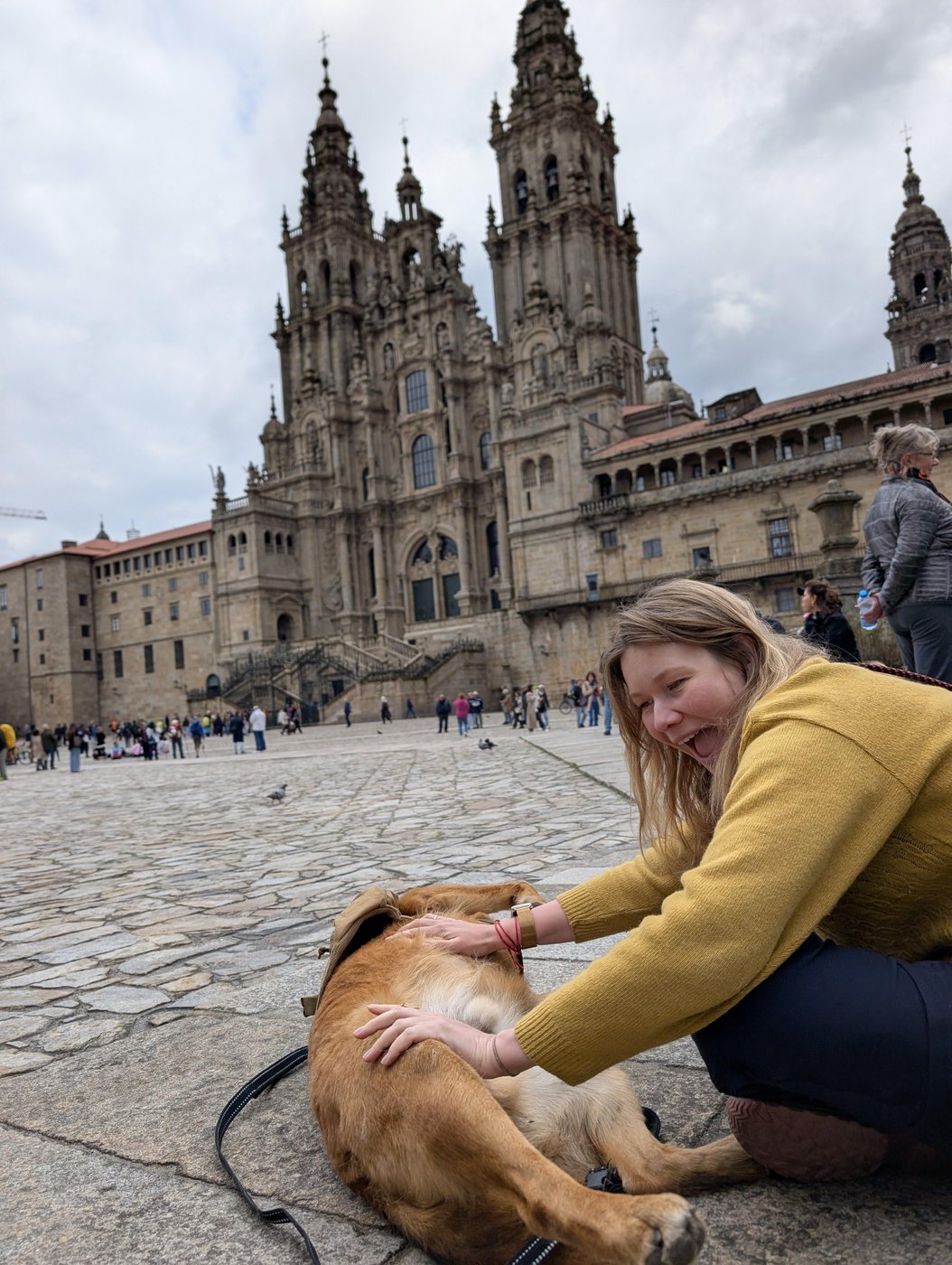 Когда мой муж и хозяин Черкиза встретил нас завершающими наш Путь у величественного и прекрасного собора Святого Иакова, мы оба были чуточку другими существами, чем уходили. Конечно, радости пса от встречи с Сашей не было предела, и он трогательно уткнулся в его колени и уснул, пока я была на торжественной мессе в соборе. Мой свитер вымочил дождь и он пах моей собакой и ладаном, и я плакала от благодарности судьбе, что у меня есть такой верный, сильный и веселый спутник, готовый на любую движуху, лишь бы быть рядом. Ну и ради круассанчика, конечно.