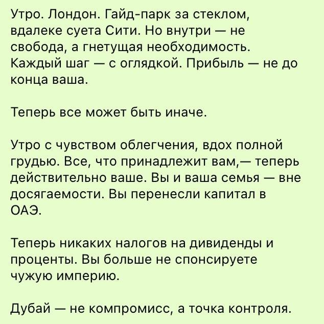 Хочется лишнь еще раз заметить— в эмиратах нету гражданства, все завязано на визе, которую в теории могут не продлить или правила для экспатов резко поменяются и без предупреждения. А в Бриташке, при всех ее минусах, есть путь к паспорту и стабильности. Вырисовывается следующий план: пожить в UK, оформить статус, а потом в эмираты пока там норм, а как что-то поменяется есть более широкое пространства для действий: вернутся в UK или поискать еще места