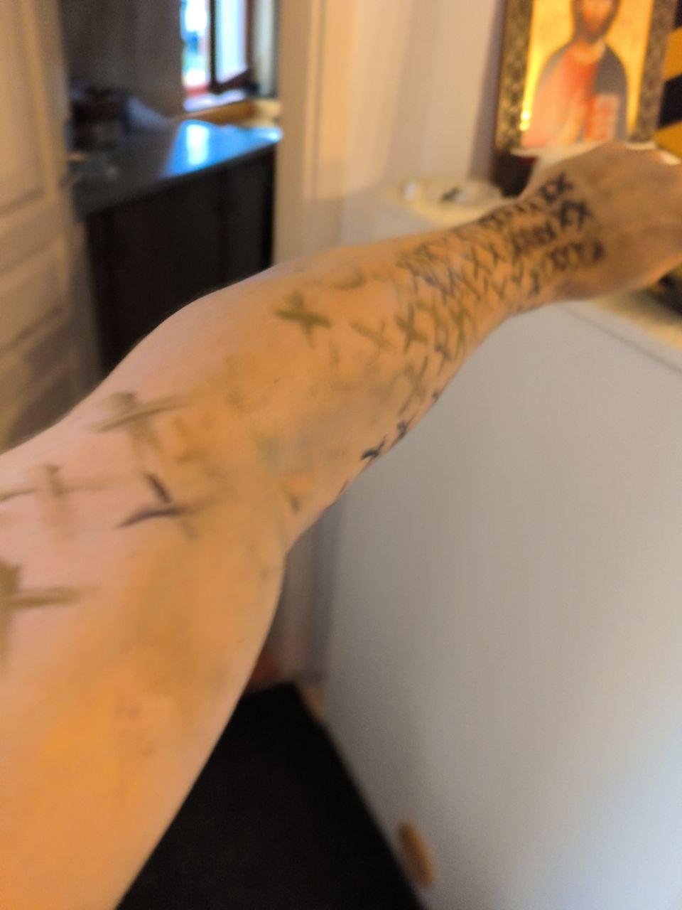 На второй день мне пришлось начать с нуля 🤷♂️ Утром я понял, что за ночь почти все кресты стёрлись, хотя я так старался не мыться и не купаться в первый день (ради искусства конечно).
