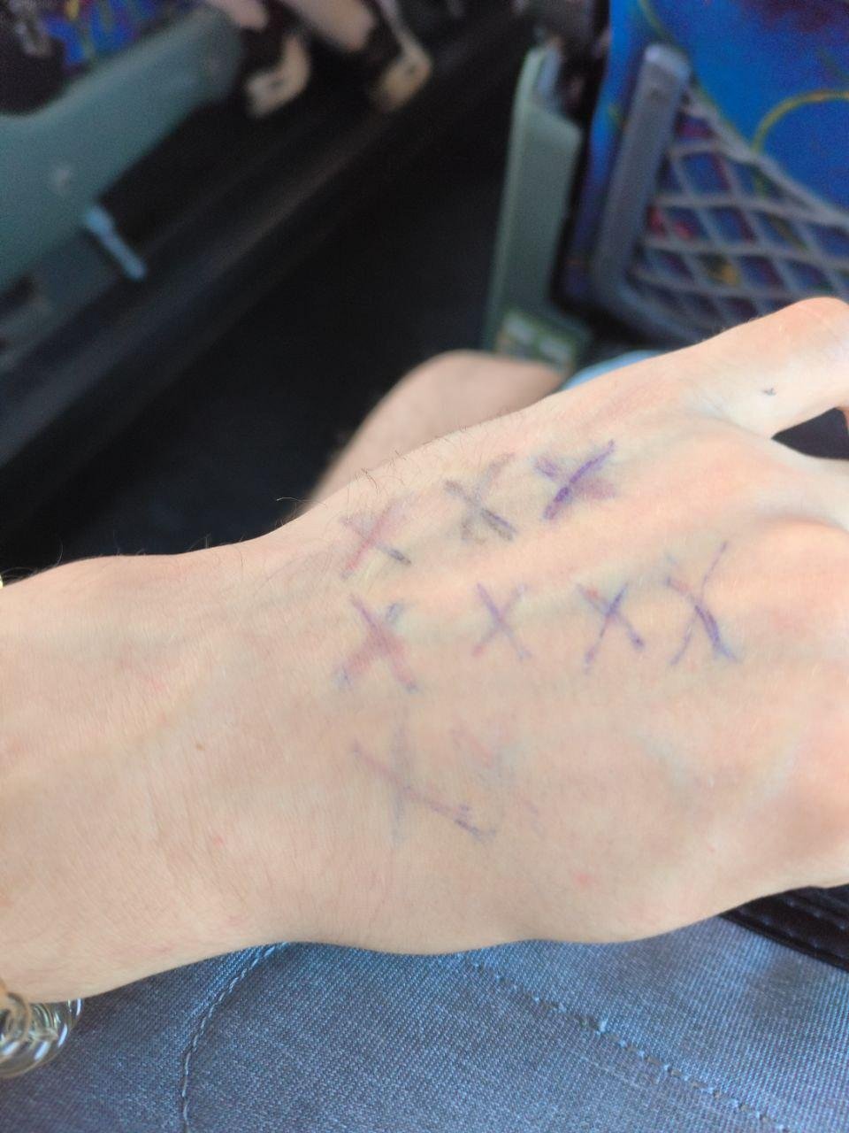 Уже в автобусе я решил ставить пометки на руку, чтобы учитывать знакомства с клубнями. Пометки начал делать крестиками, так и закрепилось. Сначала была только ручка, потом я добыл линер (спасибо Саша!). Затем уже на Кэмпе я получил 5 отличных маркеров (спасибо Костя!). Через несколько часов часть пометок стёрлась на сгибе руки 🤦♂️ и тем не менее, я собрал примерно 70 крестов к концу дня. Отличный старт, подумал я.