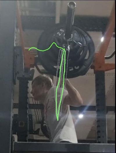Сейчас стараюсь не гнаться за весами, а сосредоточиться на технике, потому что стоит добавить немного нагрузки – и штанга начинает уходить по дуге вместо прямой. Фото шакального качества с траекторией прилагаю.