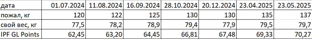 Дальше буду добивать жим 150 кг (пожалуй, основная цель 2025 года), выходить в жиме на x2 своего веса на раз. Будет особенно круто, если получится сделать это при массе тела 80 кг. Чувствую, что придется жирок подтопить прилично для этого.