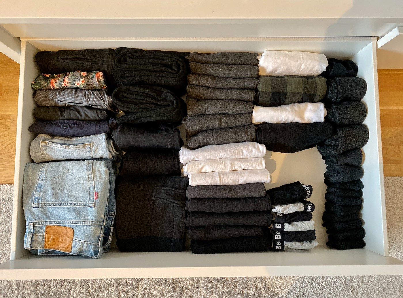 Все эти вертикальные укладывания, сортировка, ящички повсюду - это всё клёво, но на то, чтобы это упаковать уходит уйма времени. А на то, чтобы в процессе использования, например, по приходу домой снимать с себя и вертикально перепаковывать, стирать и вертикально перепаковывать, всё это сортировать между ношенным-неношенным, плюс разные штуки по разным коробочкам.