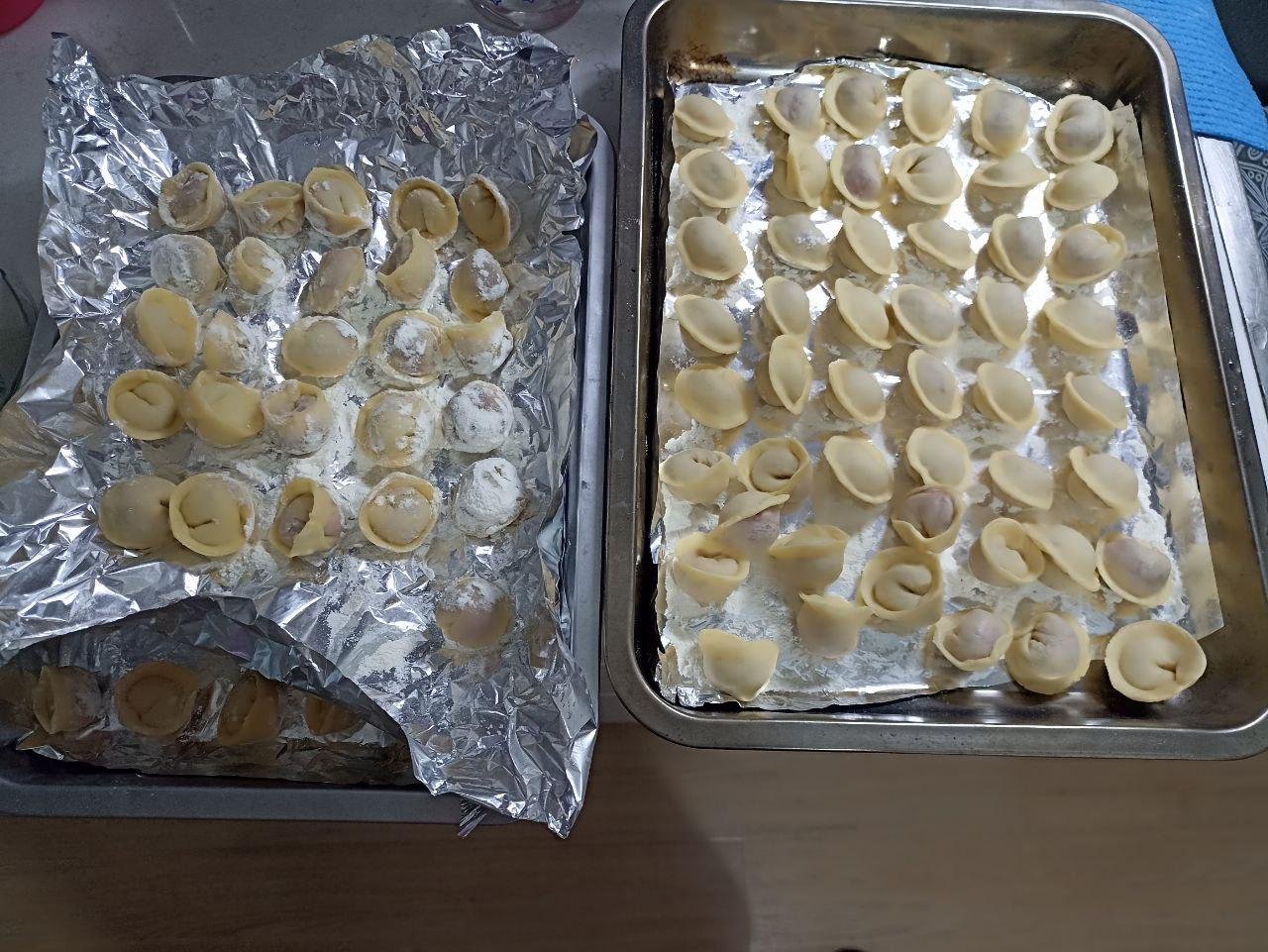 В итоге было слеплено два противня пельменей и тут же съедена половина.