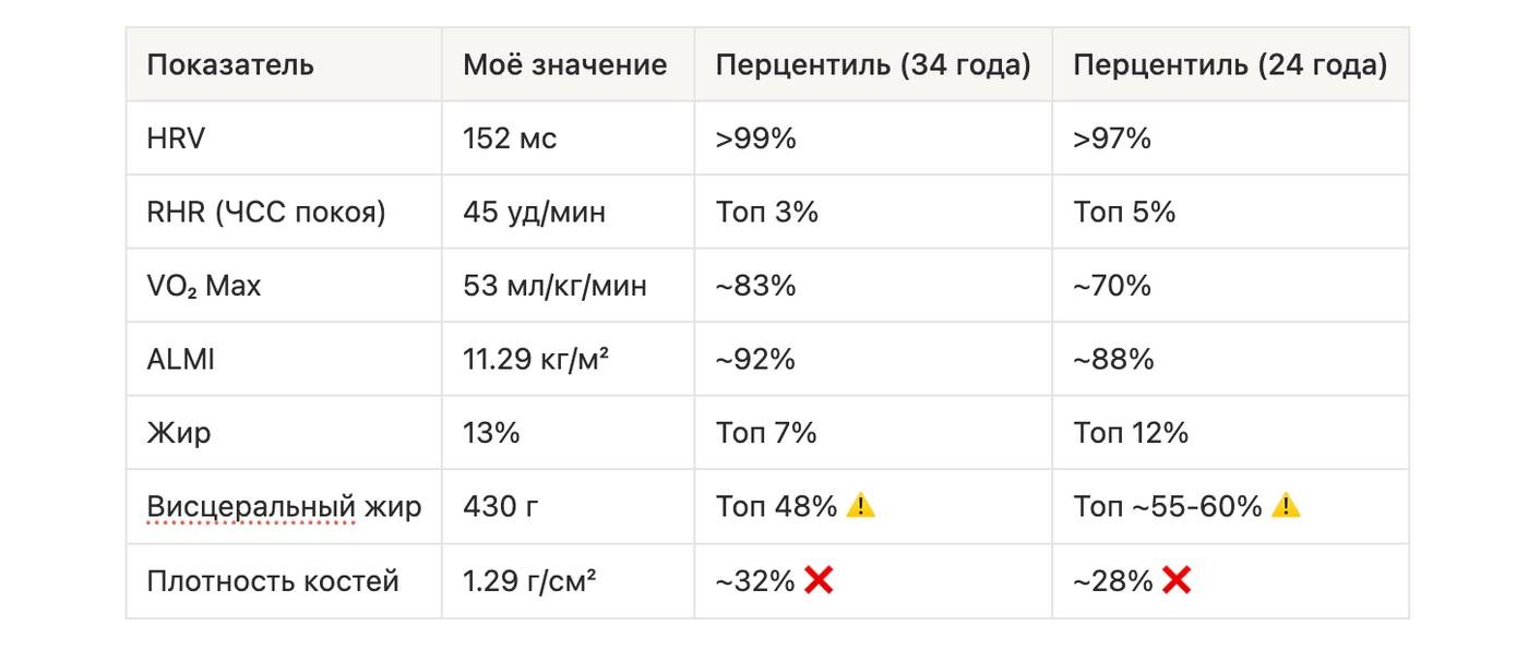 - ❌ Плотность костей: 32-й перцентиль - для моего объёма силовых очень мало. Потенциальный чёрный лебедь.