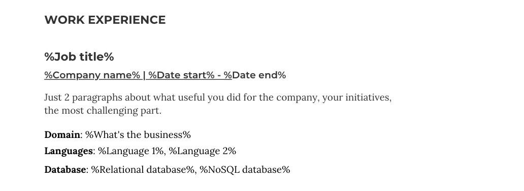 - %n years experience% - количество лет опыта согласно указанной технологии в %job title%