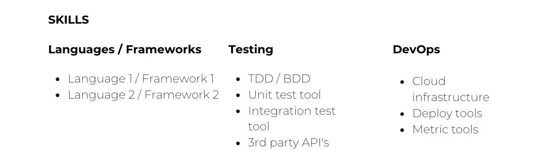 - DevOps - необязательно, но является плюсом. Указываем с какими облачными сервисами работали, какие инструменты использовали для развертывания приложения в production. Инструменты для измерения CPU, RPM, нагрузки на базу данных.