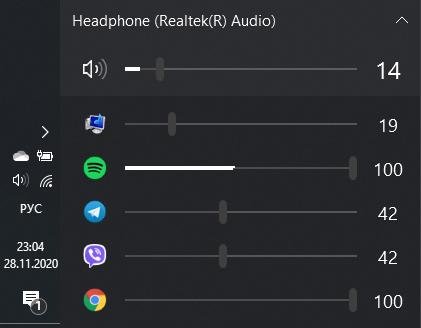 В качестве замены стандартного значка управления громкостью в трее использую приложение EarTrumpet, в котором сразу доступен микшер громкости. Выглядит всё это чудо вот так.