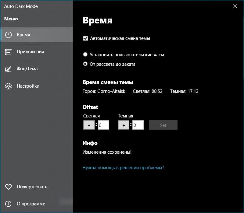 Крутая опенсорсная утилита, которая меняет тему на темную после заката или по таймеру. Также может менять обои в зависимости от текущей темы.