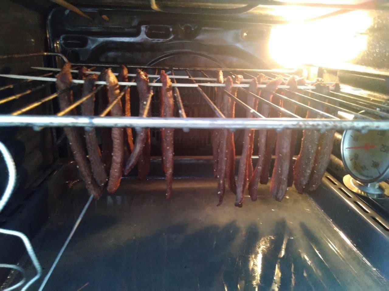 Температура воздуха в сушке или в духовке, это не температура внутри мяса. Поэтому обычный духовой термометр говорит только об исправности дегидратора или духовки.