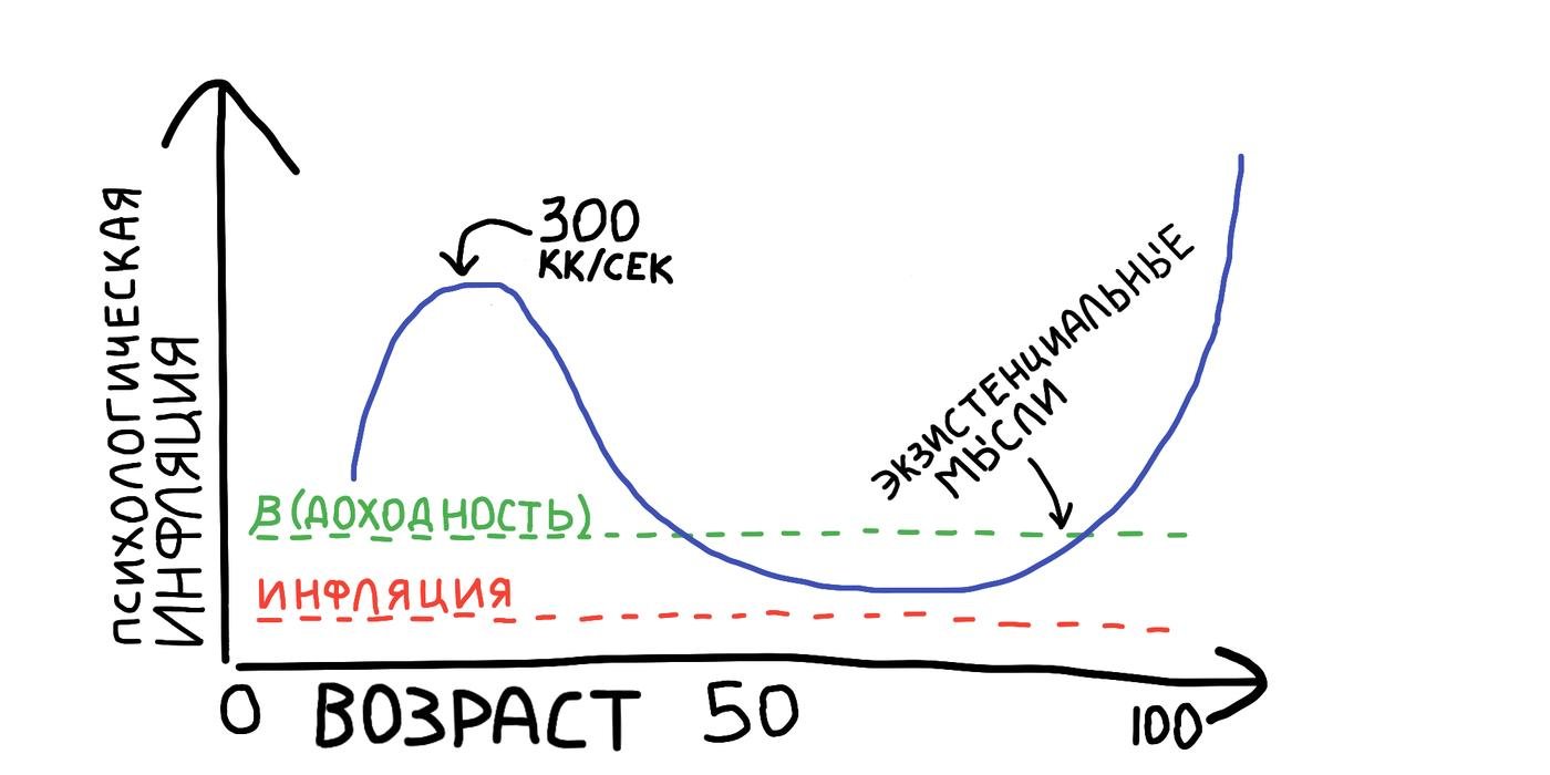 В детстве Ипполит вообще не понимал ценность денег, а потом стал их сам зарабатывать и как понял! и его психологическая инфляция начала расти, пока он не достигнет заветных 300 кк/сек. Дальше его доходы и траты стабилизируются и психологическая инфляция сблизится с настоящей. В какой-то момент Ипполит осознает конечность своего бытия и деньги в будущем потеряют для него смысл, а психологическая инфляция достигнет +∞. График психологической инфляции выглядит примерно так:
