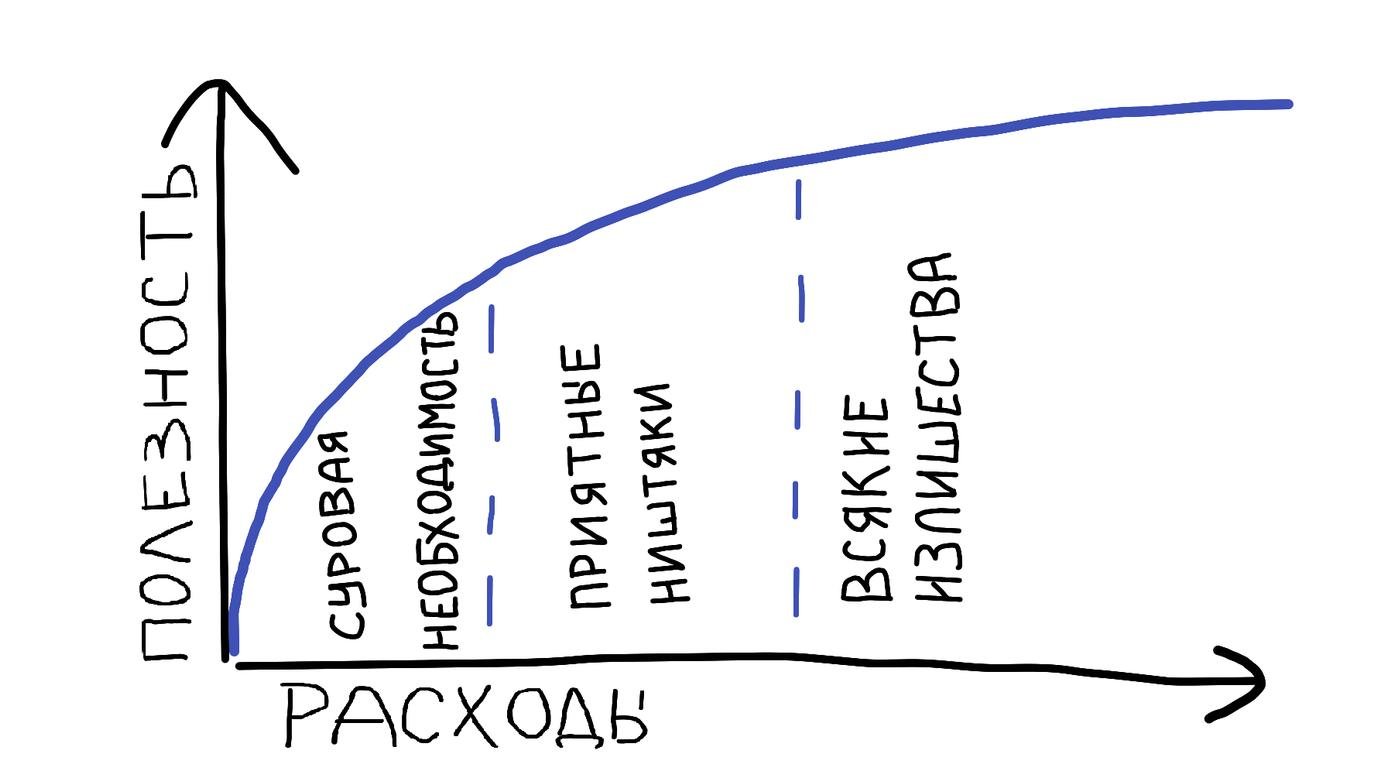 То есть первый потраченный долор приносит максимальную полезность, второй - чуть меньше, и так далее. Если сейчас Ипполит зарабатывает только 100 кк/сек, то через пять лет при доходе 300 кк/сек предельная полезность дополнительного дохода от инвестиций будет гораздо ниже.