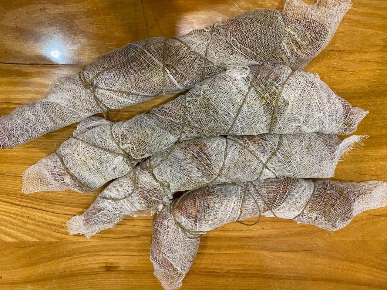 Кладем обвяленное мясо на марлю (важно марлю или очень тонкую льняную салфетку) и заматываем мясо в марлю и сверху бечевкой.