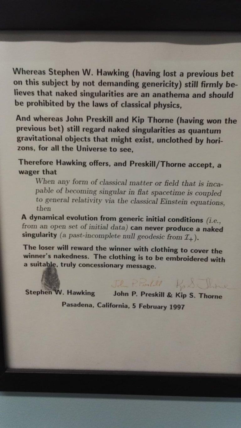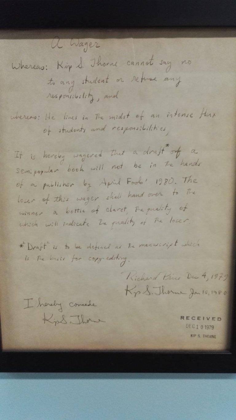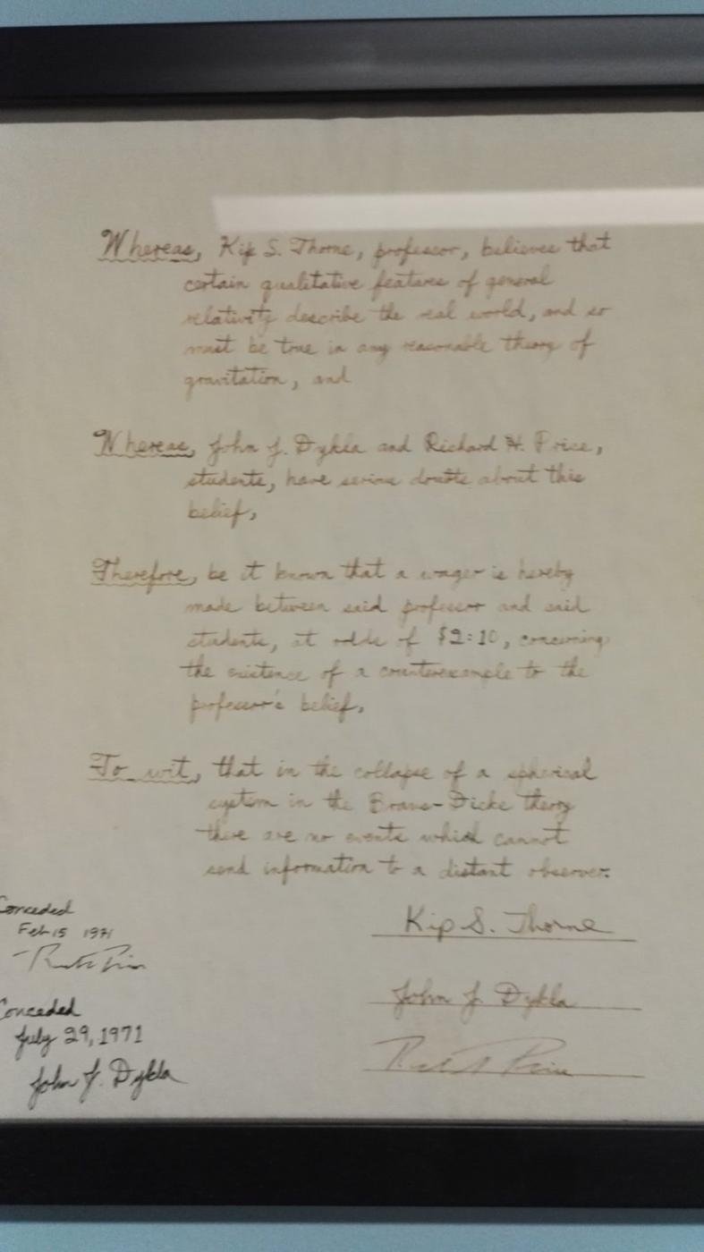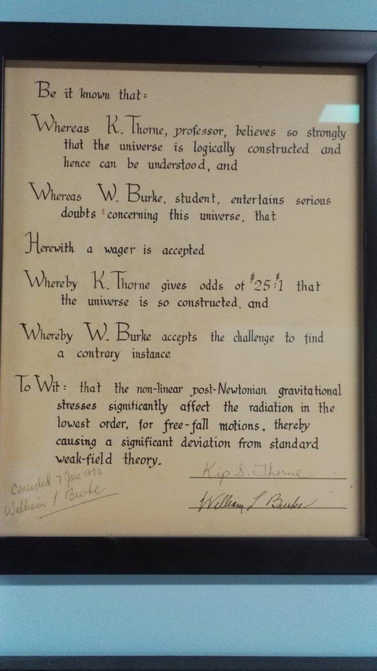 В этом здании сидит (иногда) Кип Торн, получивший Нобелевку за открытие гравитационных волн (и вообще один из главных двигателей современного состояния теории относительности). И на стене у его кабинета висят пари, заключенные между ним и другими видными физиками насчет загадок теории относительности. Представляю вам эти фотографии, расшифровки рукописи и заодно немного комментирую.