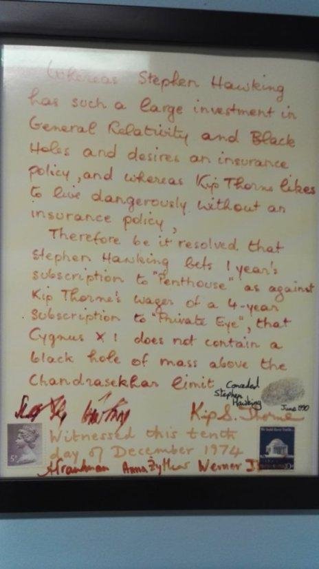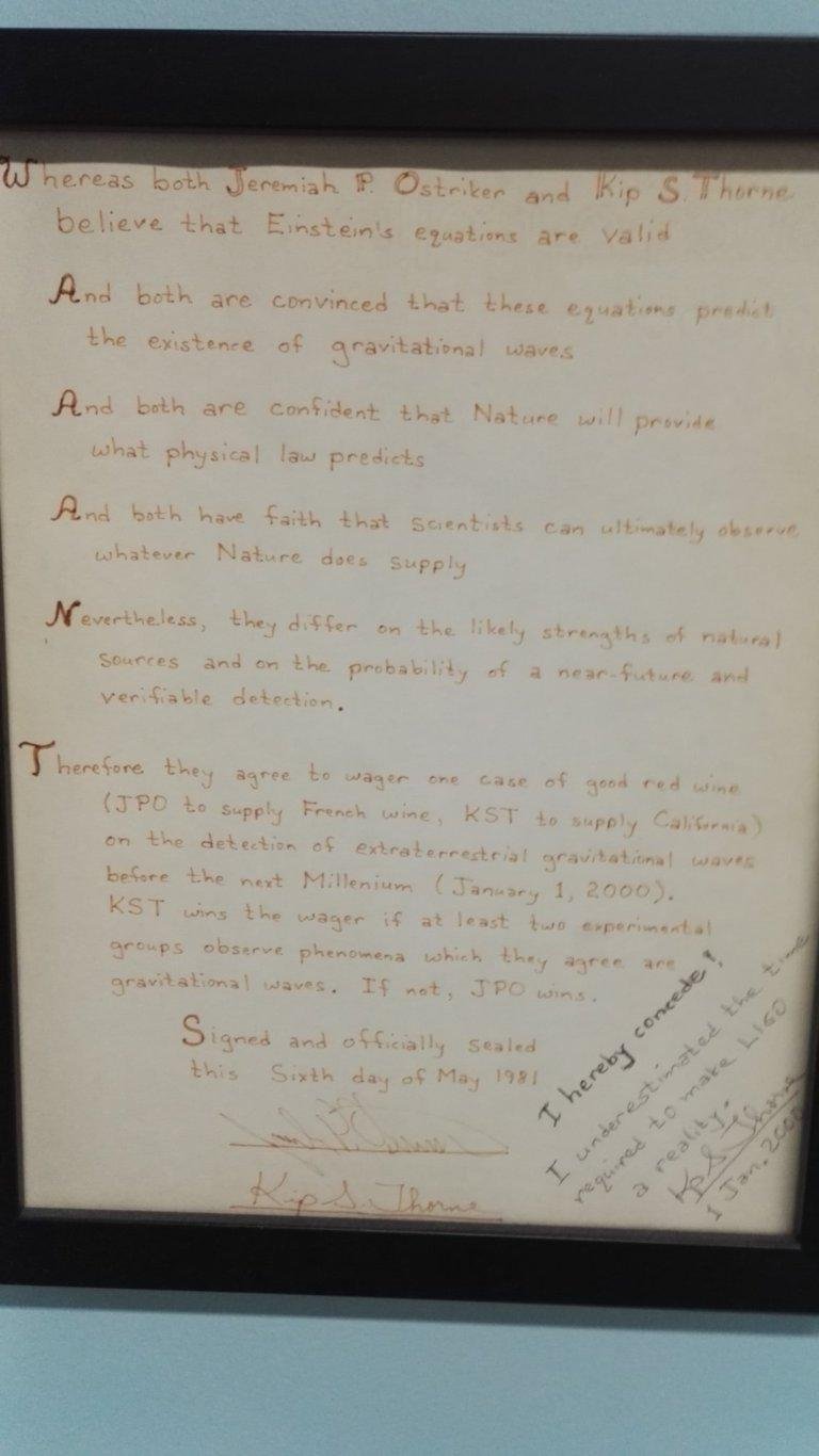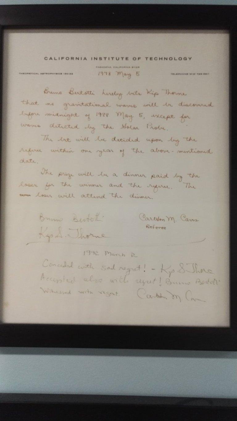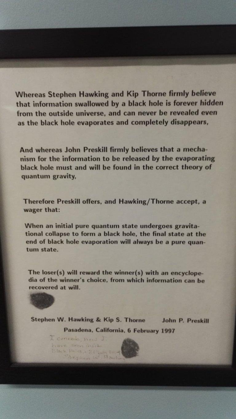 В этом здании сидит (иногда) Кип Торн, получивший Нобелевку за открытие гравитационных волн (и вообще один из главных двигателей современного состояния теории относительности). И на стене у его кабинета висят пари, заключенные между ним и другими видными физиками насчет загадок теории относительности. Представляю вам эти фотографии, расшифровки рукописи и заодно немного комментирую.