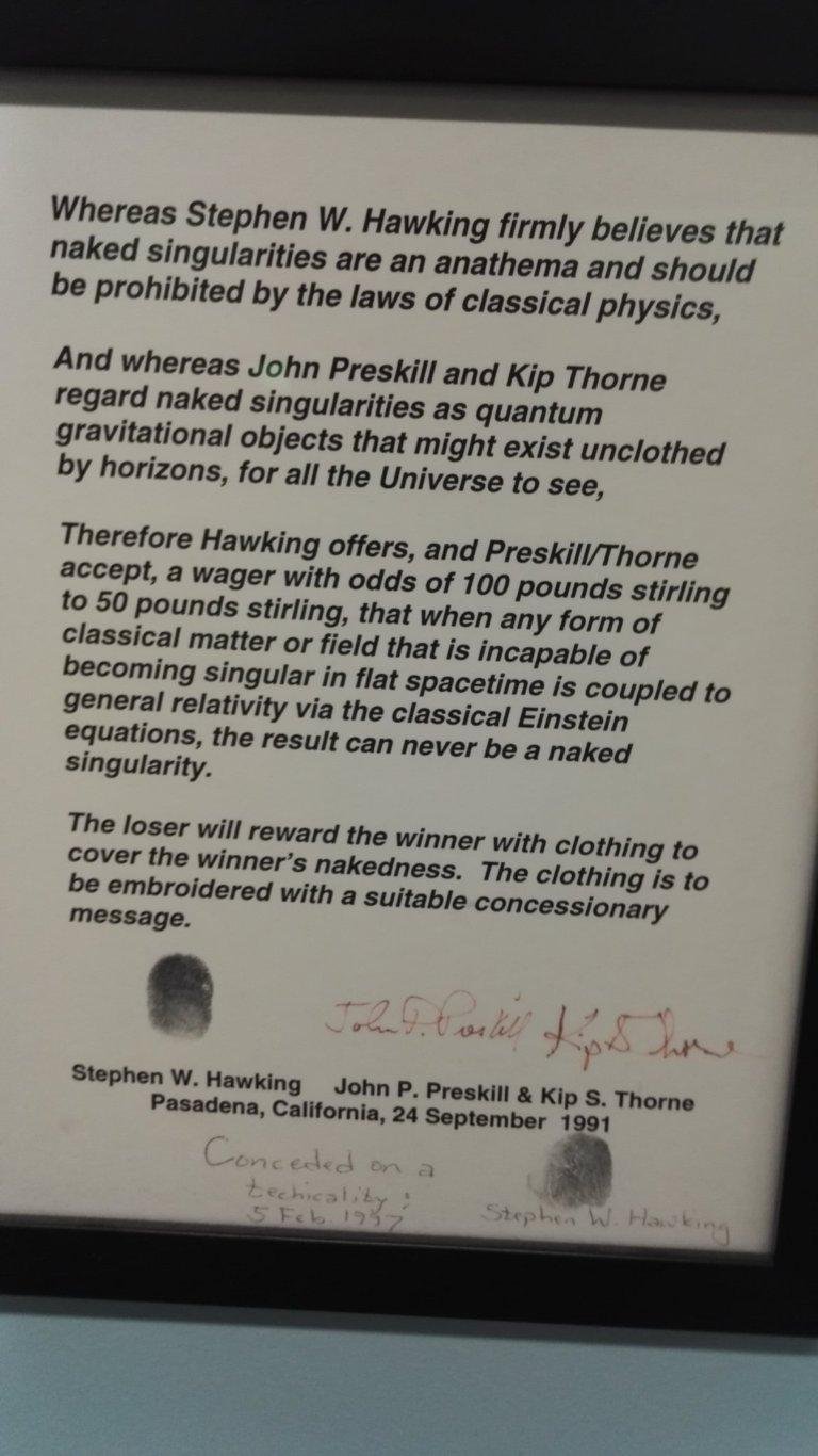 В 70х еще никто не знал, существуют ли на самом деле черные дыры. В 72 году был открыт Cygnus X1 - двойная звезда, источник радио и рентгеновского злучения. В эти годы ученые активно спорили, может ли это быть черной дырой. (Предел Чандрасекара - 1.4 солнечных массы - масса, при которой звезда коллапсирует и становится черной дырой или нейтронной звездой). Через 16 лет набралось достаточно доказательств, и Хокинг признал поражение. По слухам, он взломал офис Торна, пока тот путешествовал, и подписал бумагу с пари.