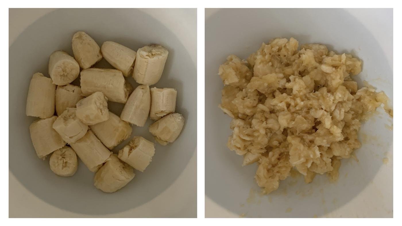 - Очистить бананы и в миске размять вилкой.