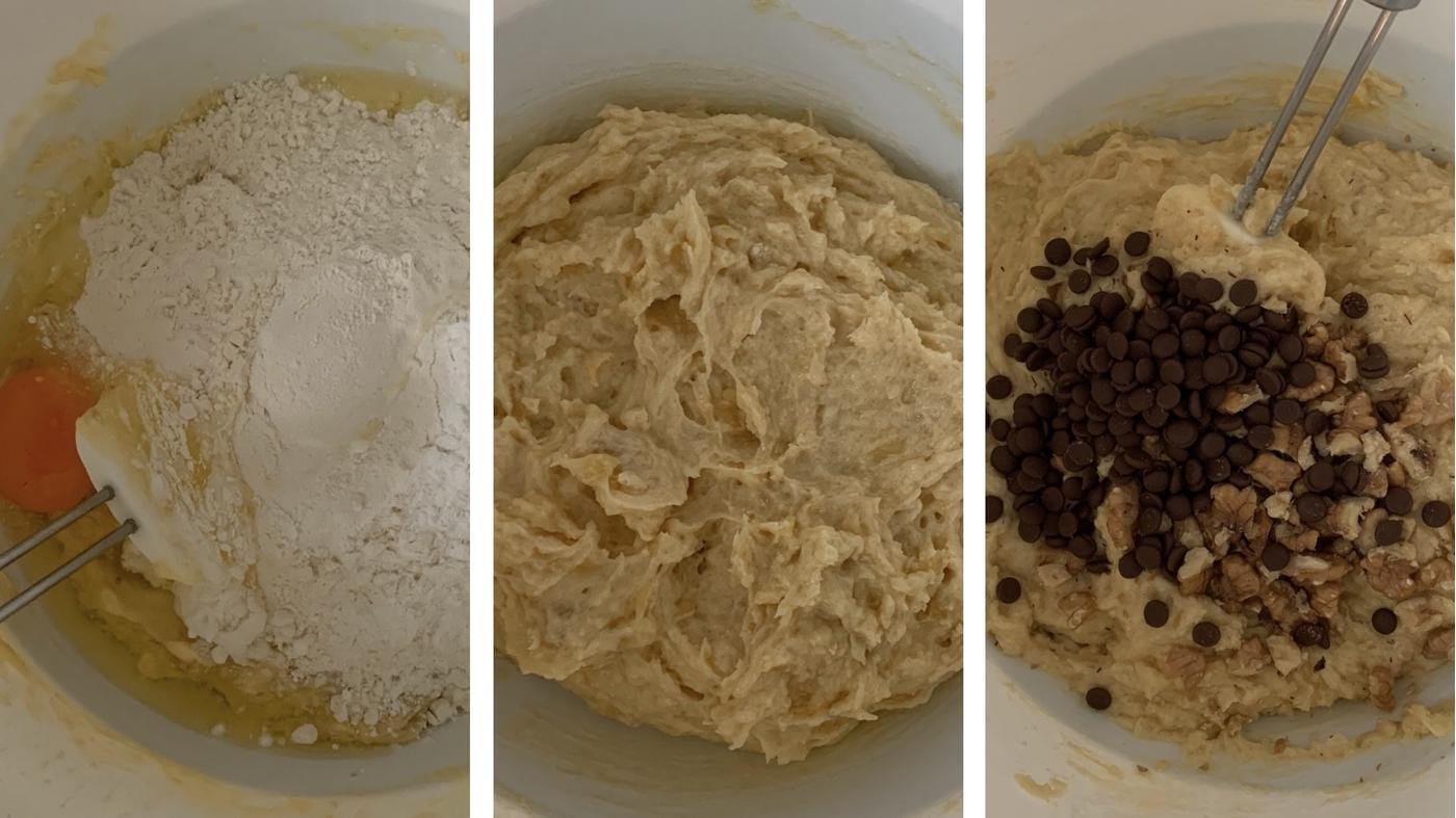 По настроению в тесто добавляю грецкие орехи, кешью или финики. Можно ещё корицы бахнуть. В этот раз закинула по 30г грецких орехов и капель молочного шоколада. Орехи ломаю руками.