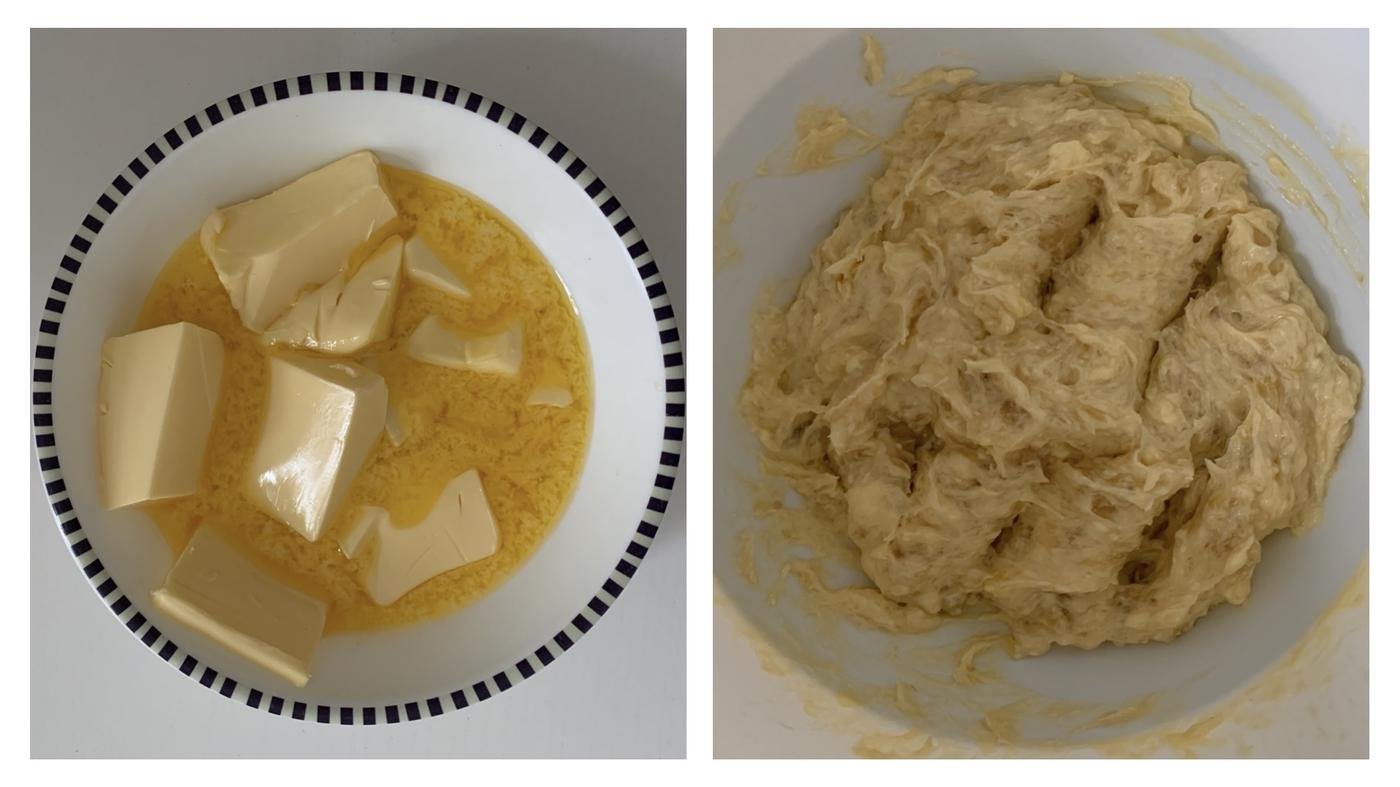 - Масло порезать кусочками и растопить в микроволновке (или в сотейнике на плите) до жидкого состояния. (У меня на фотке полужидко. Не будьте как я, растапливайте полностью)