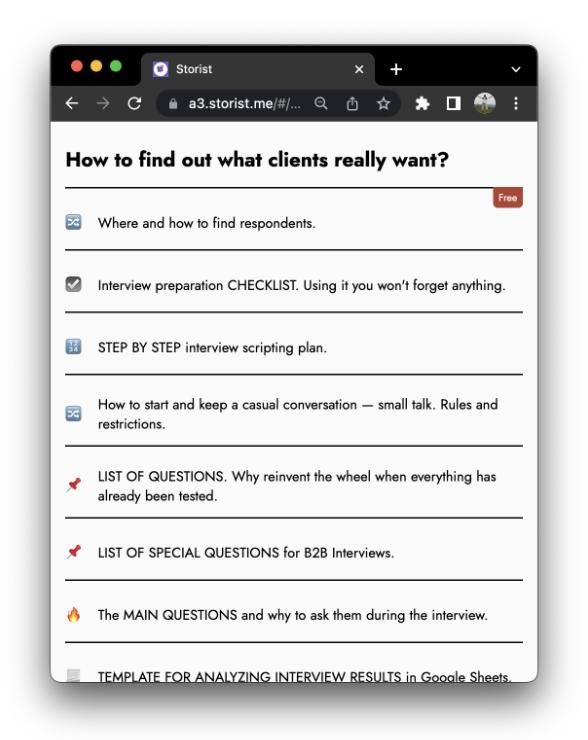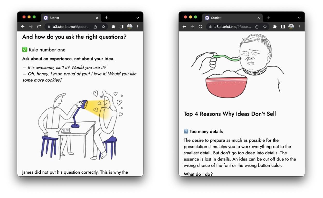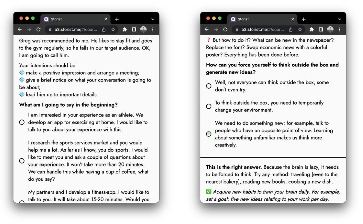 Попробовать сделать самостоятельно! Так появился сервис Storist – мини-курсы, основанные на бизнес-бестселлерах. MVP запустили летом 2021-го. Затем мы с командой провели больше 200 пользовательских интервью, 30 консультаций с методистами, авторами квестов и геймдизайнерами, что вылилось в 23 важных обновлений продукта.