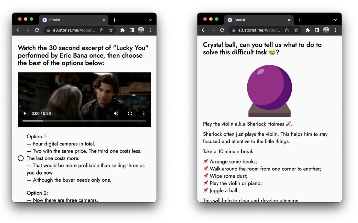 - В Storist мы добавили разнообразные тесты, мини-квесты, видео и аудио примеры каждой идеи бизнес-книги. Это дополнительная возможность повзаимодействовать с идеями и проверить свои знания.