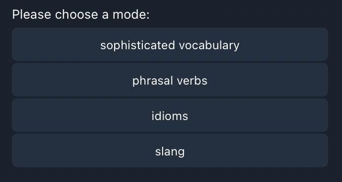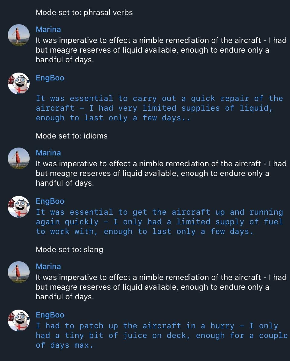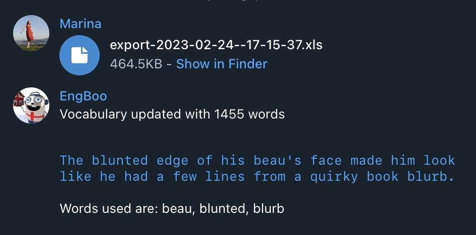 И вот некоторые идеи я все-таки реализовала в виде телеграм бота engboobot. Публикую эту статью как проект, но мне все же хочется тут описать не столько “проект”, сколько продолжение подхода к улучшению английского.