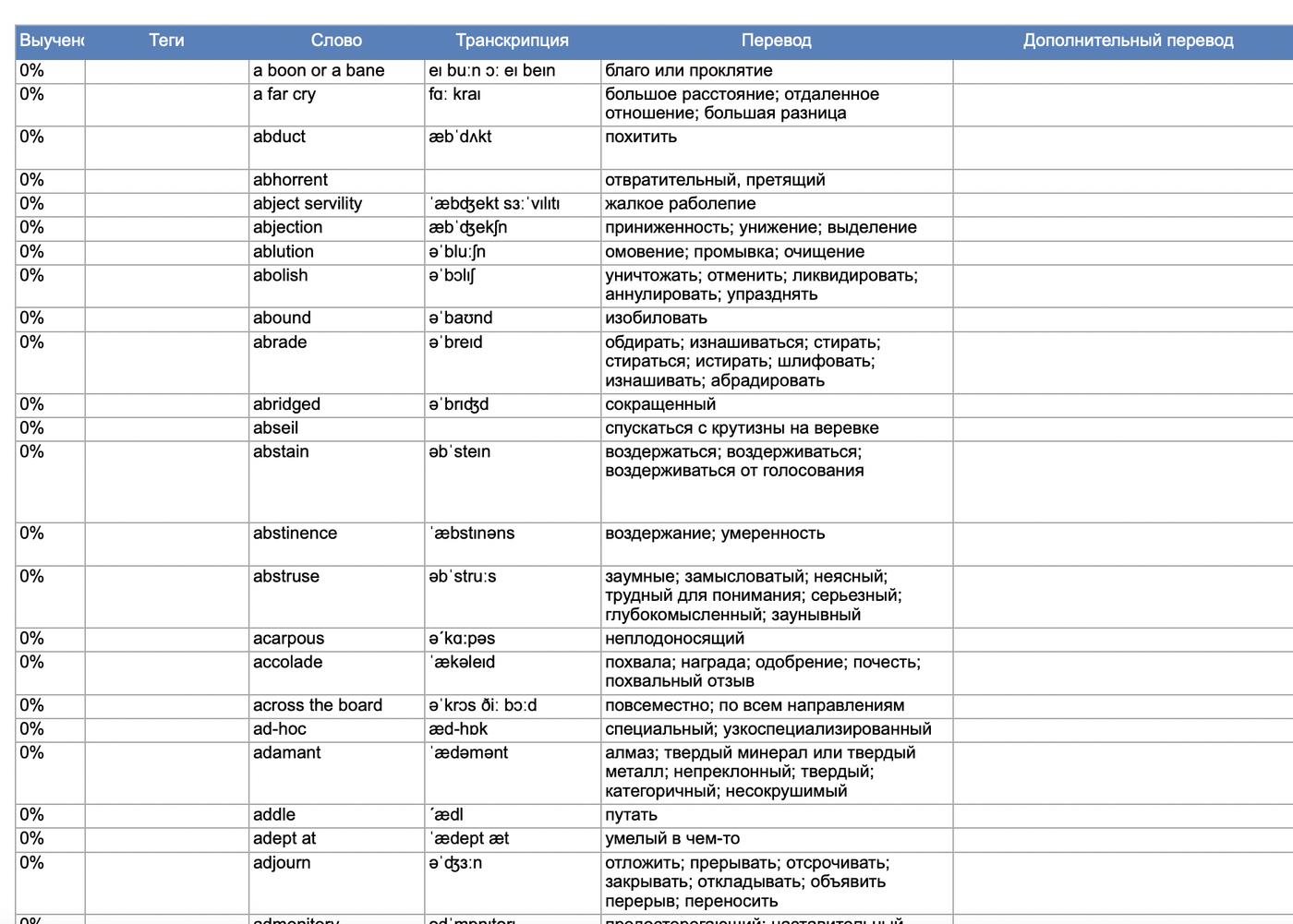 Так как я использую приложение “Мой словарь” и экспорт оттуда выглядит как-то так, мое приложение принимает на вход xls файл, где в третьем столбце, не считая хэдера, заключен список слов.