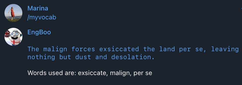 Ну или можно просто зайти и позалипать в создаваемые ботом предложения по вызову /myvocab. Это моя любимая опция: источник новых сложных предложений, которые можно затем копипастить с разными режимами и получать “переводы”. Я с этого кейса просто балдею:)