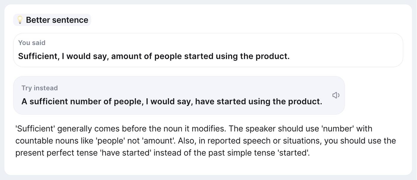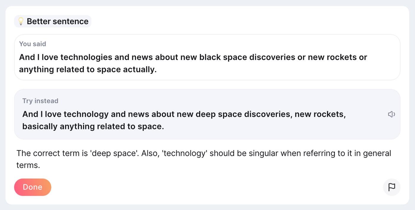 Продукт проверяет грамматику, произношение, выбор слов, длительность и расстановку пауз, тем речи. Оценивает, насколько хорошо сформулированы мысли, и находит слова-паразиты. Дает обратную связь: что было не так, что можно улучшить и как.