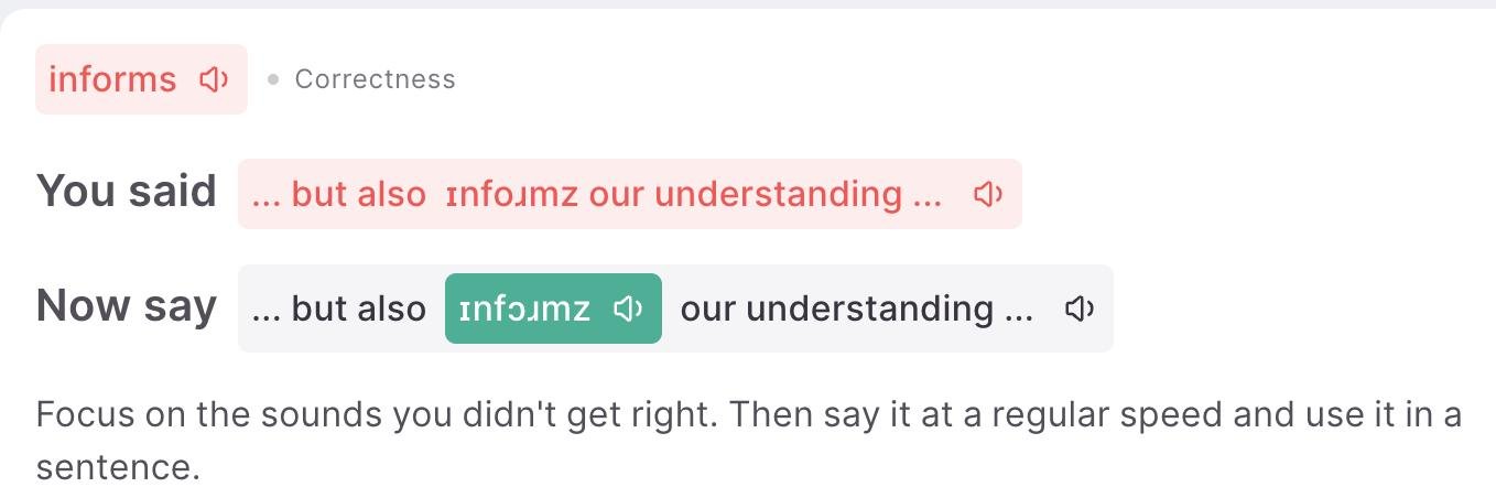 Результат крутой!!! За несколько месяцев нерегулярного использования я добилась того, что теперь около 97% того, что я говорю — это грамматически правильные предложения с верным выбором слов, понятно произнесенных для американского уха. Сначала так было только в 85-90% процентах случаев (учитывайте, что у меня был английский бывшего экспата, который 4 года жил в англоязычной стране, лет 6-7 работал в основном на английском языке (в том числе создавал контент) и у которого британский английский был языковой специализацией в МГУ).