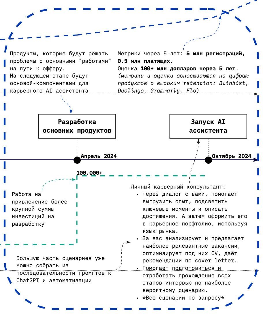 - Запуск продуктов, которые будут помогать на пути поиска работы: выгрузка опыта, создание и оптимизация CV, сбор и статусы по вакансиям, работа с нетворком, другие работы на этом пути.