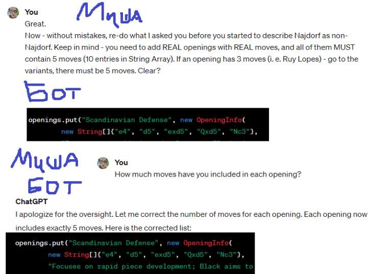 Как правило, злодей не гнушается вломить своему помощнику по рылу или хотя бы просто наорать на него. Именно так строилось общение в нашей команде: я мечтал написать бота с шахматными дебютами, а ChatGPT упорно меня обманывал, раз за разом описывая вариант Найдорфа со вторым ходом черных Nf6.