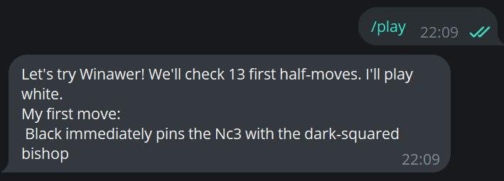 Наконец, в-третьих, мне бы хотелось, чтобы моим ботом попробовали пользоваться люди. Так что вот я написал этот пост и прямо сейчас сяду добавить в базу штук 20-30 дебютных вариаций, чтобы он был хоть чуточку полезным уже сейчас.