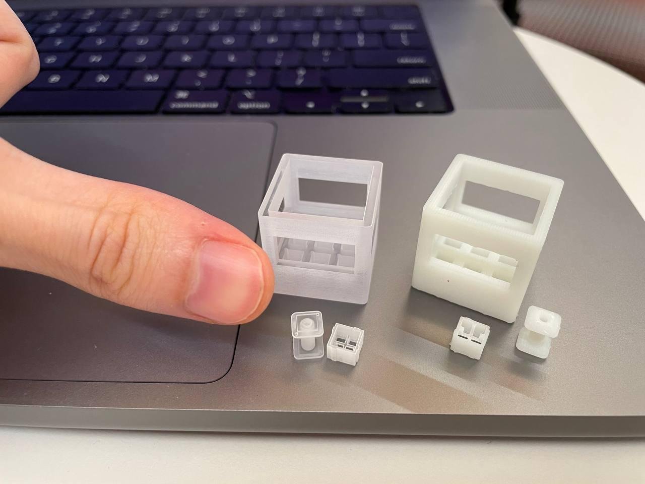 Левый прозрачный - это MJP, он супер четкий вышел и прям хрустит какой точный на этих полумиллиметровых масштабах. Жаль что для этого нужен прям промышленный принтер и цена такому развлечению крайне кусачая.