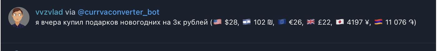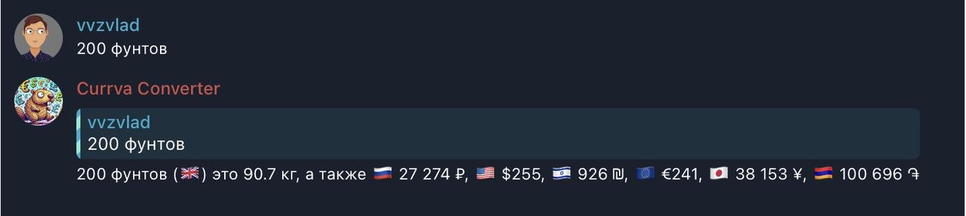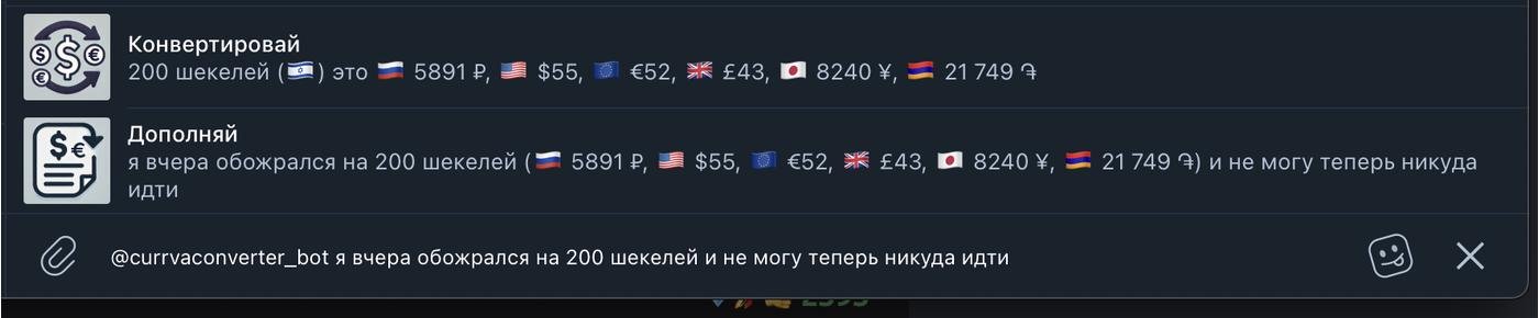 Пишем "@currvaconverter_bot я вчера обожрался на 200 шекелей и не могу теперь никуда идти", выбираем второй вариант и собеседнику уходит сообщение "я вчера обожрался на 200 шекелей (🇷🇺 5891 ₽, 🇺🇸 $55, 🇪🇺 €52, 🇬🇧 £43, 🇯🇵 8240 ¥, 🇦🇲 21 749 ֏) и не могу теперь никуда идти"