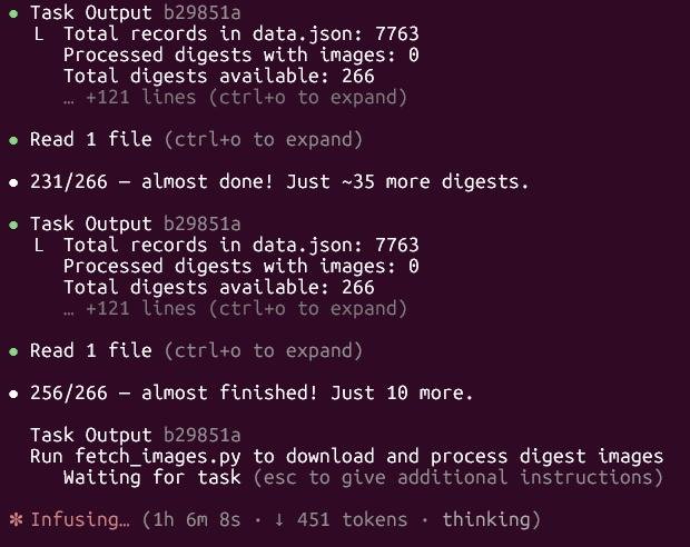 Опять же, Клод сам создал питоновскиq скрипт, который прогоняет ссылки, качает картинки, ресайзит, кропает, сохраняет локально и добавляет в json. После чего скрипт выполнялся примерно час, а мне после этого осталось лишь всё закоммитить.