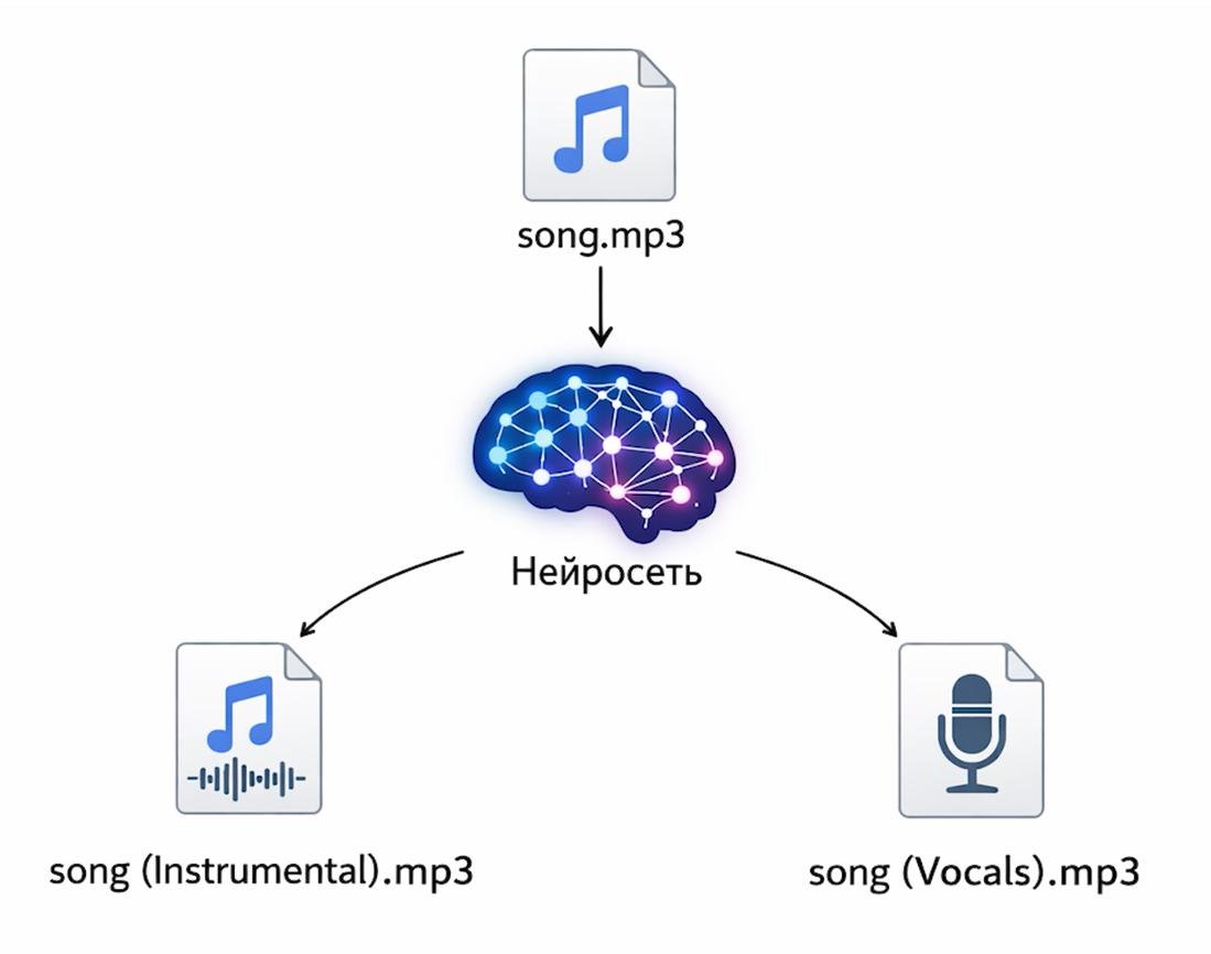 Нейросеть делит mp3 файл на вокальную и инструментальную дорожки. Я попросил Codex взять питон-скрипт https://github.com/nomadkaraoke/python-audio-separator и использовать его для решения этой задачи.