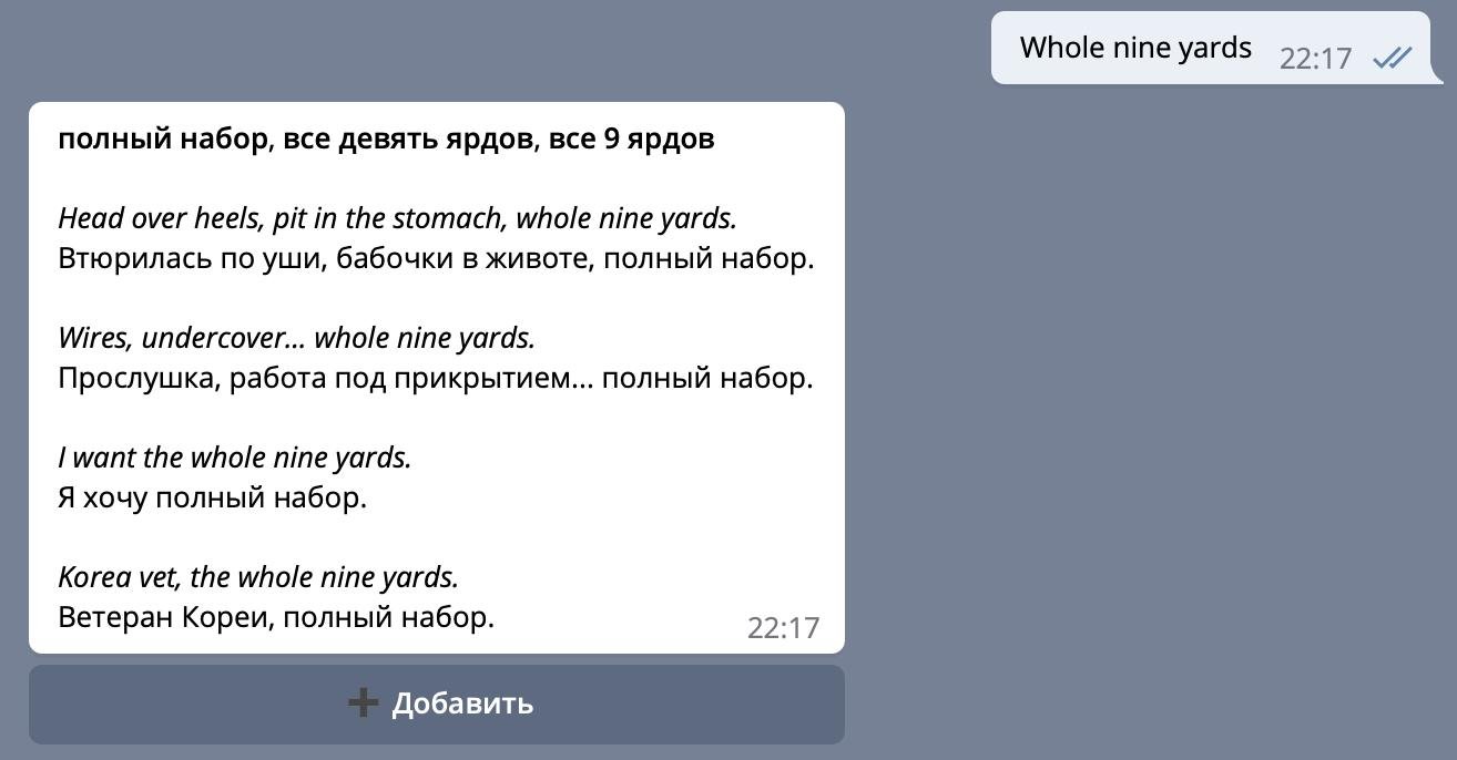 Здорово, точно бы не помешало выделять результаты среди кусков текста как в Reverso Context. Для простых слов и фраз сервис работает отлично, правда я что-то понажимал и бот перестал мне отвечать :)) Если поискать несколько слов а уже потом по истории прокликать Add то начинает тупить
