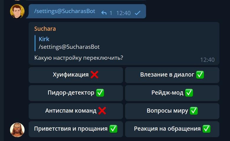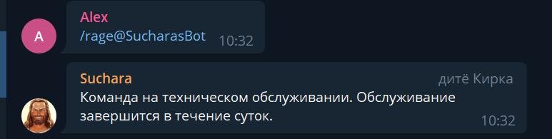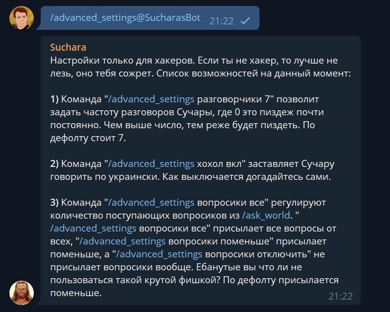 При продвижении вскрывалось много болезней, например у бота есть команда /rage, которая в течение 10 минут или 20 сообщений заставляет Сучару агриться на все сообщения капсом.