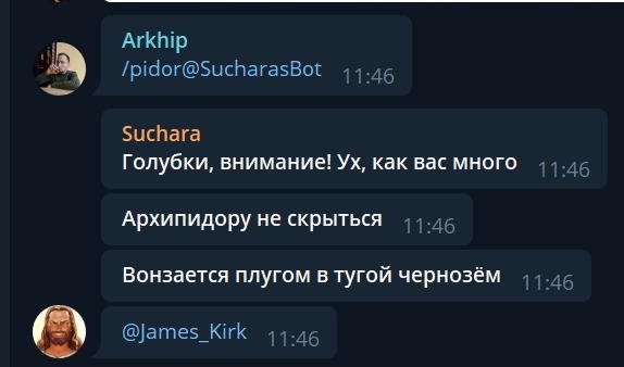 Так вот, из этой переписки Сучара и берет фразы. Фразы берутся только с русскими буквами, без цифр, латиницы, ссылок, не длиннее нескольких слов. За 3 года (день рождения Сучары -- декабрь 2017 года) я ни разу не видел чтобы сучара какие-то приватные данные смог через эти фильтры выдавать, да и кто будет реально приватные данные сливать в групповые чаты :)
