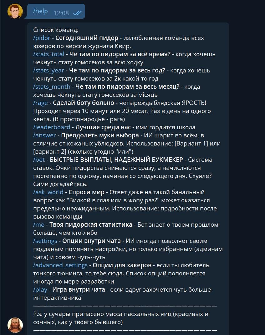 Всем советую применить данный бот в чатах с приятелями, своими людьми, близкими и родными, для трудящихся чатов он также отлично подходит, скрасит сероватые повседневности, добавит живости и яркости диалогами.