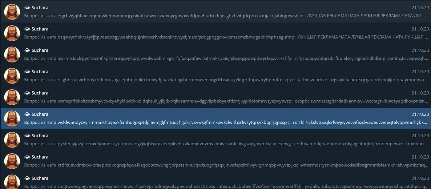 Так же при активной компании продвижения новые люди используют /ask_world и спамят тем самым другие чаты, а так же видят такое же количество спама от других, в итоге пугаются и тоже выпинывают Сучару, в итоге я не придумал ничего лучше, кроме как снизить количество чатов в которые рассылаются сообщения.