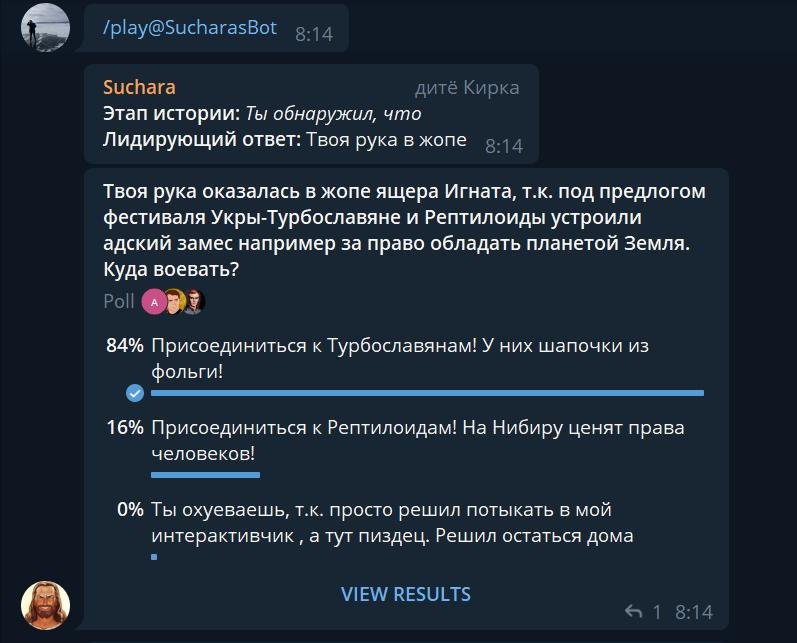 Есть так же идея вынести это в другого бота и там продвигать уже как коллективную текстовую игру, но встает вопрос написания хорошего сценария.