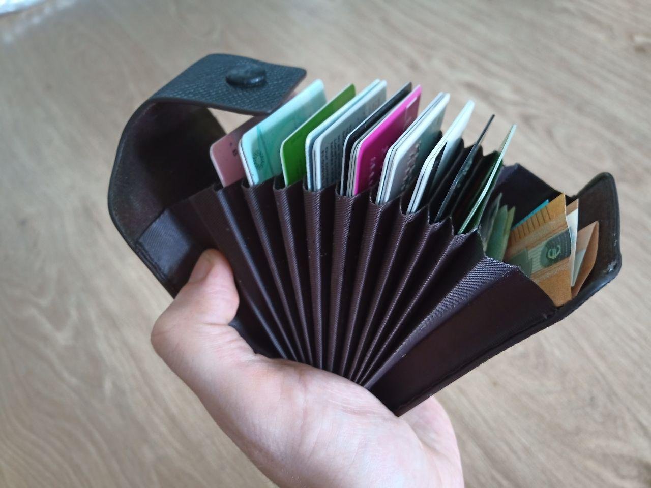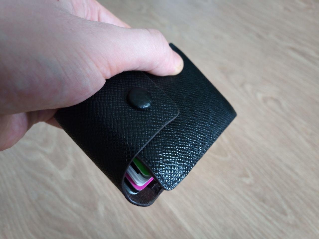 В этом плане формат, упомянутый в этом комменте будет немного более удобным (опять же по опыту с алика): так как карты выезжают лесенкой, то потом достать оттуда одну конкретную куда легче, перехват делать не надо, курюры не вертятся, потому что они находятся под этой кожаной оберткой. Но если сами карты плохого качества, то из-за того, что ты их достаешь и вставляешь по одной и они так трутся друг об дружку, то верхний слой пластика может начать облазить. У меня так с одной карты начал отслаиваться даже слой с магнитной лентой, а другая стала похожа на облезлую гадюку