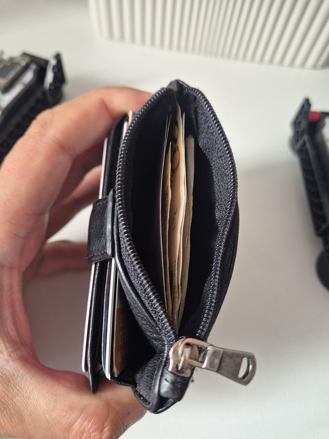 Из неудобностей - банкноты хранятся в сложенном виде, как в зажиме. Я к такому не привык с большим бумажником, и чтобы достать купюру из середины - всю пачку надо доставать целиком и потом складывать назад. С другой стороны, надо просто сокращать количество кеша в жизни.