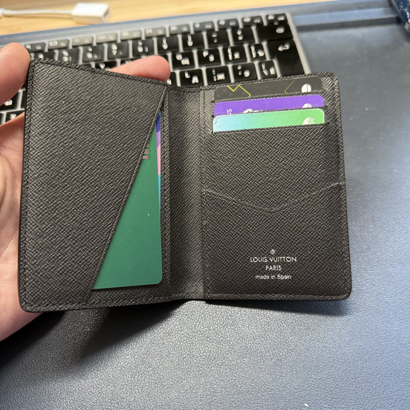 При этом, умещает штук 6 самых нужных карточек + при необходимости чуть-чуть кеша (либо сложить вчетверо и засунуть в карманчик, либо сложить вдвое и носить зажатыми в бумажнике).