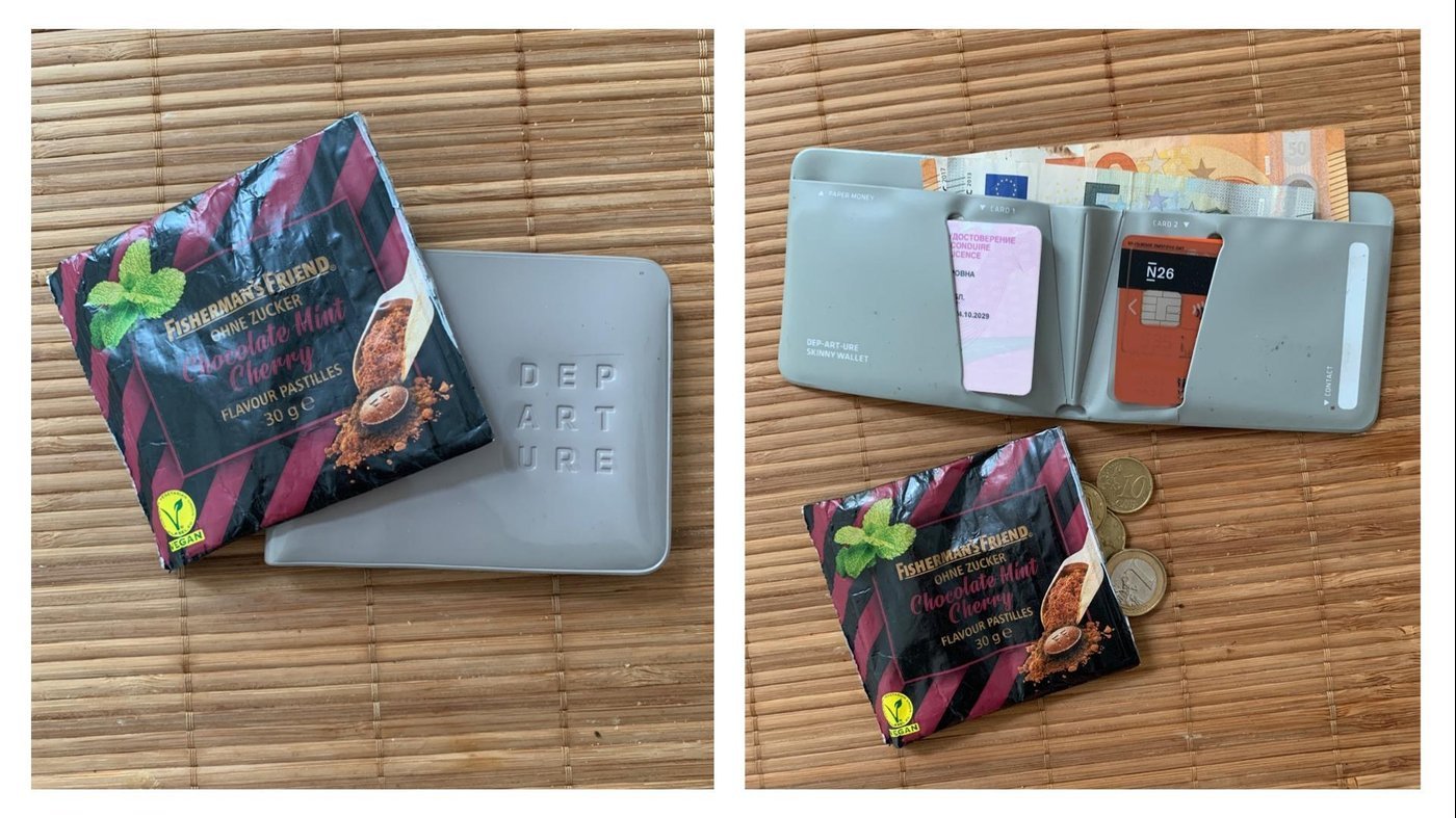 Skinny Wallet oт Alife Design для банкнот и карточек и пакетик от конфет для монеток.